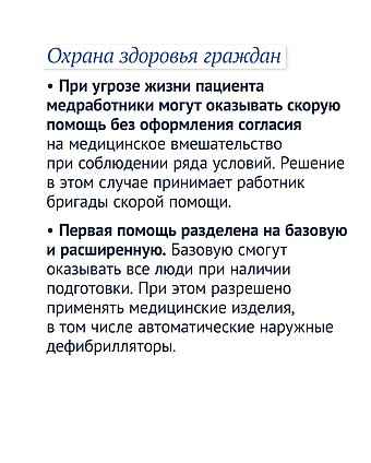 Первая помощь разделена на базовую и расширенную. Базовую смогут оказывать все люди при наличии подготовки. При этом разрешено применять медицинские изделия, в том числе автоматические наружные дефибрилляторы.