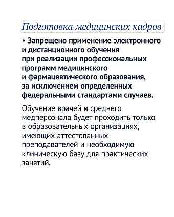 Запрещено применение электронного и дистанционного обучения при реализации профессиональных программ медицинского и фармацевтического образования за исключением определенных федеральными стандартами случаев. Обучение врачей и среднего медперсонала будет проходить только в образовательных организациях, имеющих аттестованных преподавателей и необходимую клиническую базу для практических занятий.