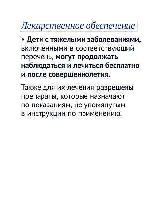 Дети с тяжелыми заболеваниями, включенными в соответствующий перечень, могут продолжать наблюдаться и лечиться бесплатно и после совершеннолетия. Также для их лечения разрешены препараты, которые назначают по показаниям, не упомянутым в инструкции по применению.