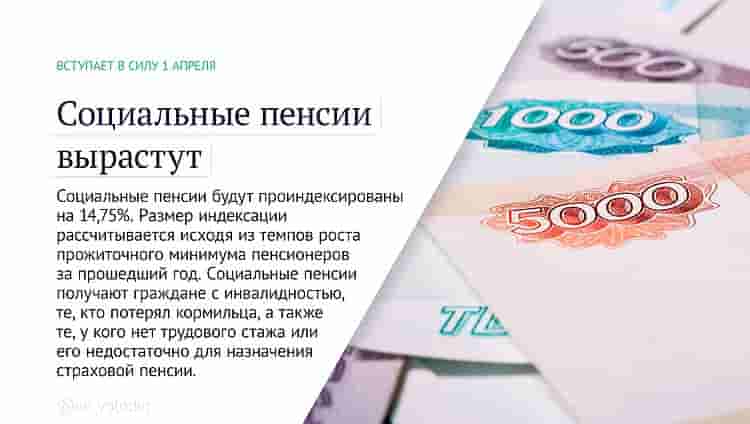Социальные пенсии будут проиндексированы на 14,75 %. Размер индексации рассчитывается исходя из темпов роста прожиточного минимума пенсионеров за прошедший год. Социальные пенсии получают граждане с инвалидностью, те, кто потерял кормильца, а также те, у кого нет трудового стажа или его недостаточно для назначения страховой пенсии.