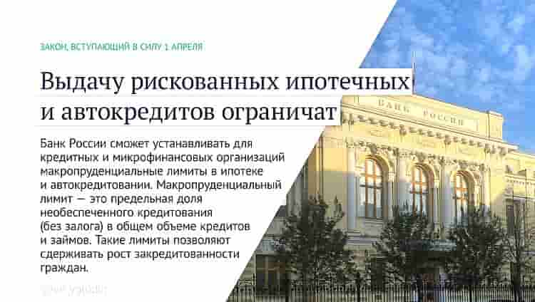 Банк России сможет устанавливать для кредитных и микрофинансовых организаций макропруденциальные лимиты в ипотеке и автокредитовании. Макропруденциальный лимит — это предельная доля необеспеченного кредитования (без залога) в общем объеме кредитов и займов. Такие лимиты позволяют сдерживать рост закредитованности граждан.