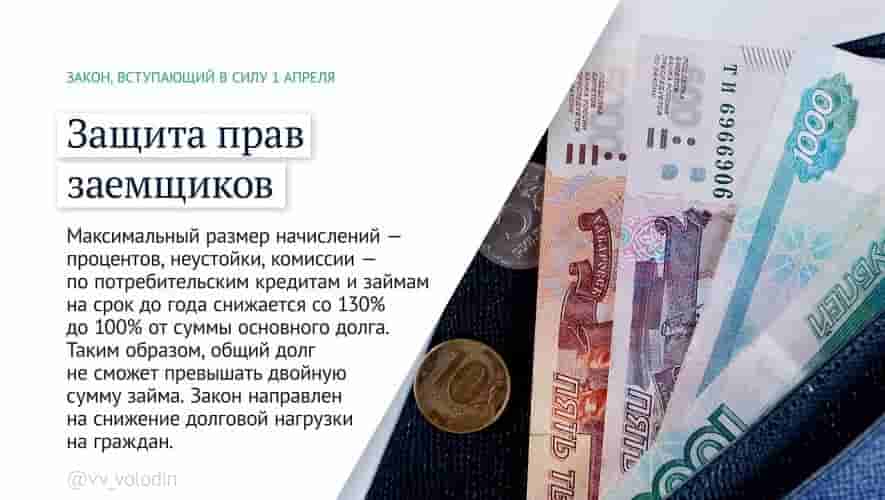 Максимальный размер начислений — процентов, неустойки, комиссии — по потребительским кредитам и займам на срок до года снижается с 130 % до 100 % от суммы основного долга. Таким образом, общий долг не сможет превышать двойную сумму займа. Закон направлен на снижение долговой нагрузки на граждан.