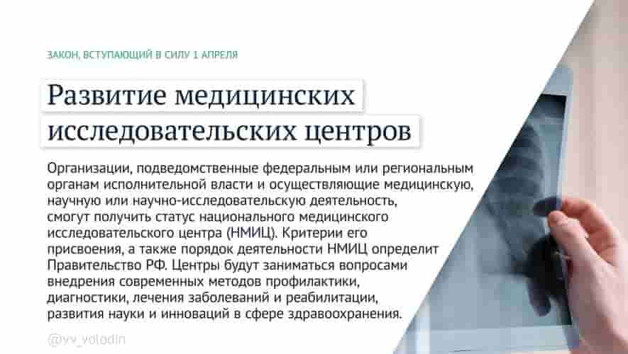Организации, подведомственные федеральным или региональным органам исполнительной власти и осуществляющие медицинскую, научную или научно-исследовательскую деятельность, смогут получить статус национального медицинского исследовательского центра (НМИЦ). Критерии его присвоения, а также порядок деятельности НМИЦ определит Правительство РФ. Центры будут заниматься вопросами внедрения современных методов профилактики, диагностики, лечения заболеваний и медицинской реабилитации, развития науки и инноваций в сфере здравоохранения.