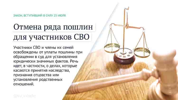 Участники СВО и члены их семей освобождены от уплаты пошлины при обращении в суд для установления юридически значимых фактов. Речь идет, в частности, о делах, которые касаются принятия наследства, признания отцовства или установления родственных отношений.