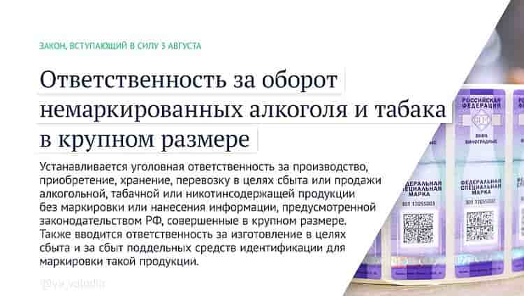 Устанавливается уголовная ответственность за производство, приобретение, хранение, перевозку в целях сбыта или продажи алкогольной, табачной или никотинсодержащей продукции без маркировки или нанесения информации, предусмотренной законодательством РФ, совершенные в крупном размере. Также вводится ответственность за изготовление в целях сбыта и за сбыт поддельных средств идентификации для маркировки такой продукции.