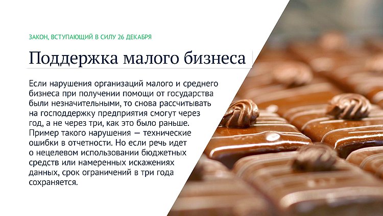 Если нарушения организаций малого и среднего бизнеса при получении помощи от государства были незначительными, то снова рассчитывать на господдержку предприятия смогут через год, а не через три, как это было раньше. Пример такого нарушения — технические ошибки в отчетности. Но если речь идет о нецелевом использовании бюджетных средств или намеренных искажениях данных, срок ограничений в три года сохраняется.