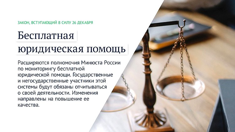 Расширяются полномочия Минюста России по мониторингу бесплатной юридической помощи. Государственные и негосударственные участники этой системы будут обязаны отчитываться о своей деятельности. Изменения направлены на повышение ее качества.