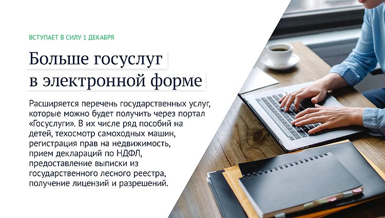 Расширяется перечень государственных услуг, которые можно будет получить через портал «Госуслуги». В их числе ряд пособий на детей, техосмотр самоходных машин, регистрация прав на недвижимость, прием деклараций по НДФЛ, предоставление выписки из государственного лесного реестра, получение лицензий и разрешений.