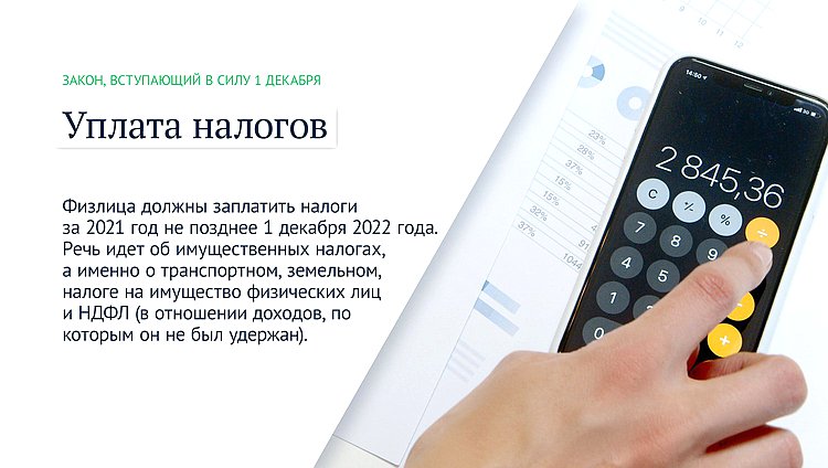 Физлица должны заплатить налоги за 2021 год не позднее 1 декабря 2022 года. Речь идет об имущественных налогах, а именно о транспортном, земельном, налоге на имущество физических лиц и НДФЛ (в отношении доходов, по которым он не был удержан).