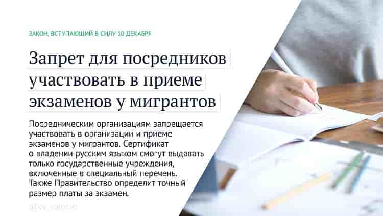 Посредническим организациям запрещается участвовать в организации и приеме экзаменов у мигрантов. Сертификат о владении русским языком смогут выдавать только государственные учреждения, включенные в специальный перечень. Также Правительство определит точный размер платы за экзамен.