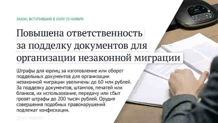 Штрафы для юрлиц за изготовление или оборот поддельных документов для организации незаконной миграции увеличены до 60 млн рублей. За подделку документов, штампов, печатей или бланков, их использование, передачу или сбыт грозят штрафы до 200 тысяч рублей. Орудия совершения подобных правонарушений подлежат конфискации.