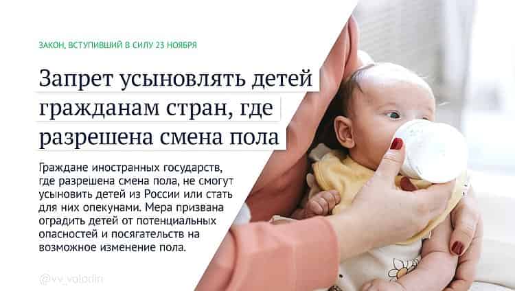 Граждане иностранных государств, где разрешена смена пола, не смогут усыновить детей из России или стать для них опекунами. Мера призвана оградить детей от потенциальных опасностей и посягательства на возможное изменение пола.