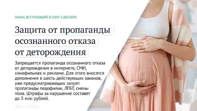 Запрещается пропаганда осознанного отказа от деторождения в интернете, СМИ, кинофильмах и рекламе. Для этого вносятся дополнения в шесть действующих законов, уже предусматривающих запрет пропаганды педофилии, ЛГБТ, смены пола. Штрафы за нарушение составят до 5 млн рублей.