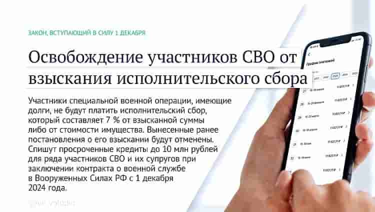 Участники специальной военной операции, имеющие долги, не будут платить исполнительский сбор, который составляет 7 % от взысканной суммы либо от стоимости имущества. Вынесенные ранее постановления о его взыскании будут отменены. Спишут просроченные кредиты до 10 млн рублей для ряда участников СВО и их супругов при заключении контракта о военной службе в Вооруженных Силах РФ с 1 декабря 2024 года.