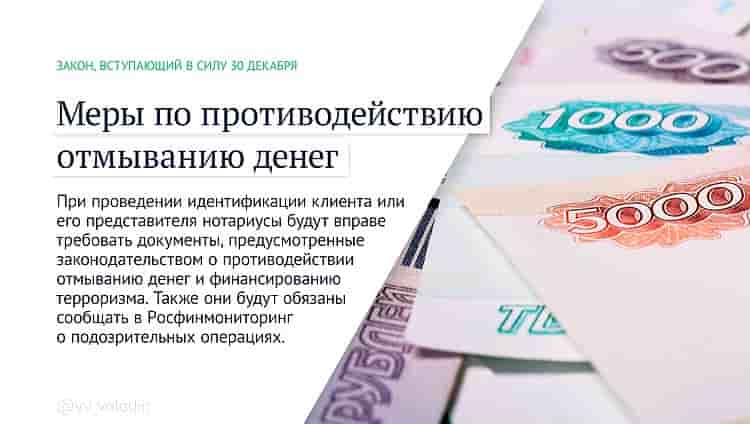 При проведении идентификации клиента или его представителя нотариусы будут вправе требовать документы, предусмотренные законодательством о противодействии отмыванию денег и финансированию терроризма. Также они будут обязаны сообщать в Росфинмониторинг о подозрительных операциях.