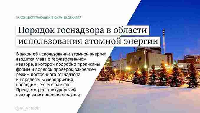 В закон об использовании атомной энергии вводится глава о государственном надзоре, в которой подробно прописаны формы и порядок проверок, закреплен режим постоянного госнадзора и определены мероприятия, проводимые в его рамках. Предусмотрен прокурорский надзор за исполнением закона.