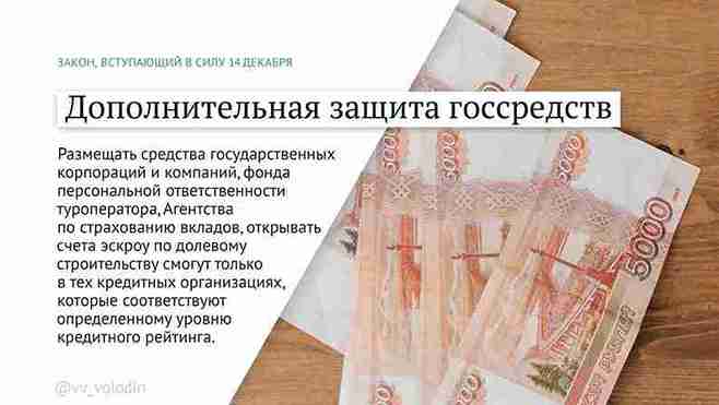 Размещать средства государственных корпораций и компаний, фонда персональной ответственности туроператора, Агентства по страхованию вкладов, открывать счета эскроу по долевому строительству смогут только в тех кредитных организациях, которые соответствуют определенному уровню кредитного рейтинга.