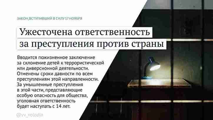 Вводится пожизненное заключение за склонение детей к террористической или диверсионной деятельности. Отменены сроки давности по всем преступлениям этой направленности. За умышленные преступления в этой части, представляющие особую опасность для общества, уголовная ответственность будет наступать с 14 лет.