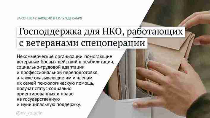 Некоммерческие организации, помогающие ветеранам боевых действий в реабилитации, социально-трудовой адаптации и профессиональной переподготовке, а также оказывающие им и членам их семей психологическую помощь, получат статус социально ориентированных и право на государственную и муниципальную поддержку.