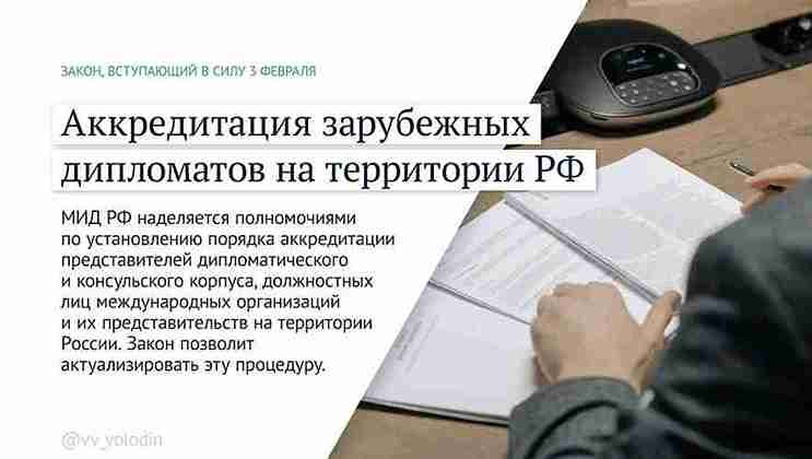 МИД РФ наделяется полномочиями по установлению порядка аккредитации представителей дипломатического и консульского корпуса, должностных лиц международных организаций и их представительств на территории России. Закон позволит актуализировать эту процедуру.