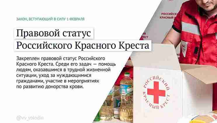 Закреплен правовой статус Российского Красного Креста. Среди его задач — помощь людям, оказавшимся в трудной жизненной ситуации, уход за нуждающимися гражданами, участие в мероприятиях по развитию донорства крови.