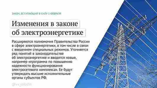 Расширяются полномочия Правительства России в сфере электроэнергетики, в том числе в связи с введением специальных режимов. Уточняется ряд понятий в законодательстве об электроэнергетике и вводятся новые, например «программа по повышению надежности функционирования электросетевого комплекса». Ее будут утверждать высшие исполнительные органы субъектов РФ.