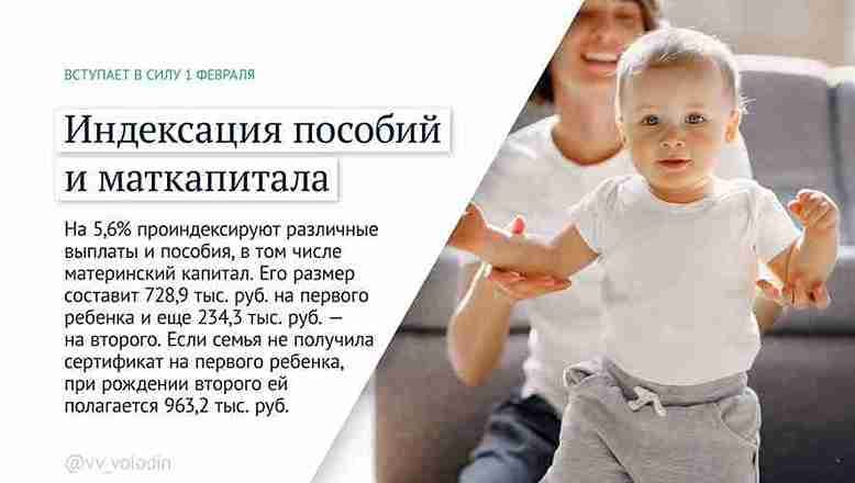 На 5,6 % проиндексируют различные выплаты и пособия, в том числе материнский капитал. Его размер составит 728,9 тыс. рублей на первого ребенка и еще 234,3 тыс. рублей — на второго. Если семья не получила сертификат на первого ребенка, при рождении второго ей полагается 963,2 тыс. рублей.