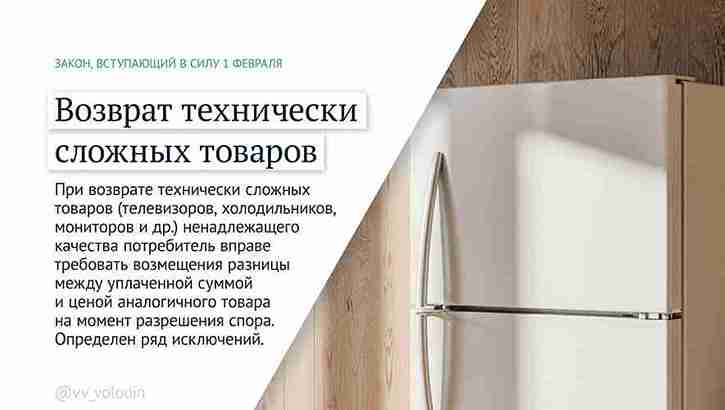 При возврате технически сложных товаров (телевизоров, холодильников, мониторов и др.) ненадлежащего качества потребитель вправе требовать возмещения разницы между уплаченной суммой и ценой аналогичного товара на момент разрешения спора. Определен ряд исключений.