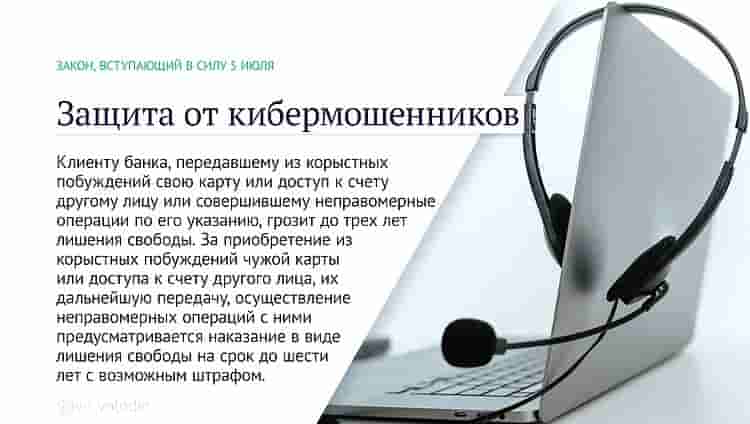 Клиенту банка, передавшему из корыстных побуждений свою карту или доступ к счету другому лицу или совершившему неправомерные операции по его указанию, грозит до трех лет лишения свободы. За приобретение из корыстных побуждений чужой карты или доступа к счету другого лица, их дальнейшую передачу, осуществление неправомерных операций с ними предусматривается наказание в виде лишения свободы на срок до шести лет с возможным штрафом.