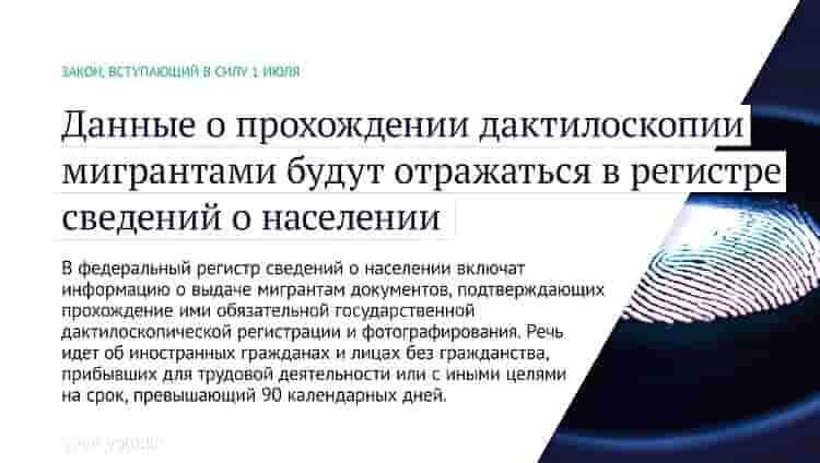 В федеральный регистр сведений о населении включат информацию о выдаче мигрантам документов, подтверждающих прохождение ими обязательной государственной дактилоскопической регистрации и фотографирования. Речь идет об иностранных гражданах и лицах без гражданства, прибывших для трудовой деятельности или с иными целями на срок, превышающий 90 календарных дней.