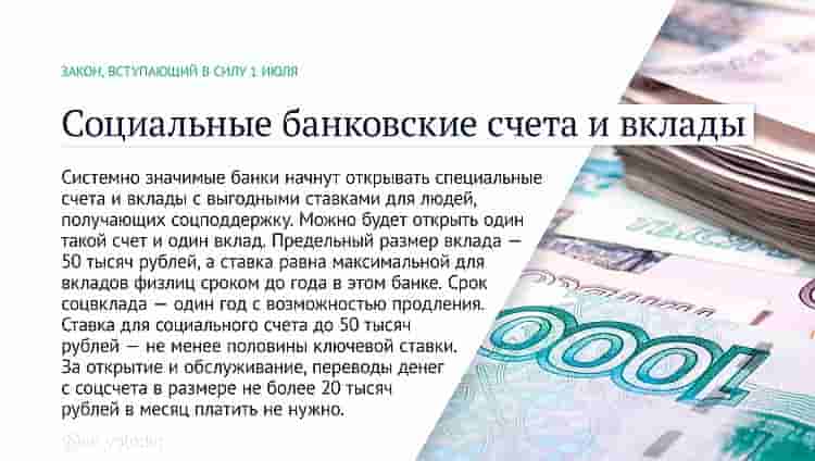 Системно значимые банки начнут открывать специальные счета и вклады с выгодными ставками для людей, получающих соцподдержку. Можно будет открыть один такой счет и один вклад. Предельный размер вклада — 50 тысяч рублей, а ставка равна максимальной для вкладов физлиц сроком до года в этом банке. Срок соцвклада — один год с возможностью продления. Ставка для социального счета до 50 тысяч рублей — не менее половины ключевой ставки. За открытие и обслуживание, переводы денег с соцсчета в размере не более 20 тысяч рублей в месяц платить не нужно.