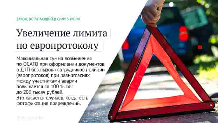 Максимальная сумма возмещения по ОСАГО при оформлении документов о ДТП без вызова сотрудников полиции (европротокол) при разногласиях между участниками аварии повышается со 100 тысяч до 200 тысяч рублей. Это касается случаев, когда есть фотофиксация повреждений.