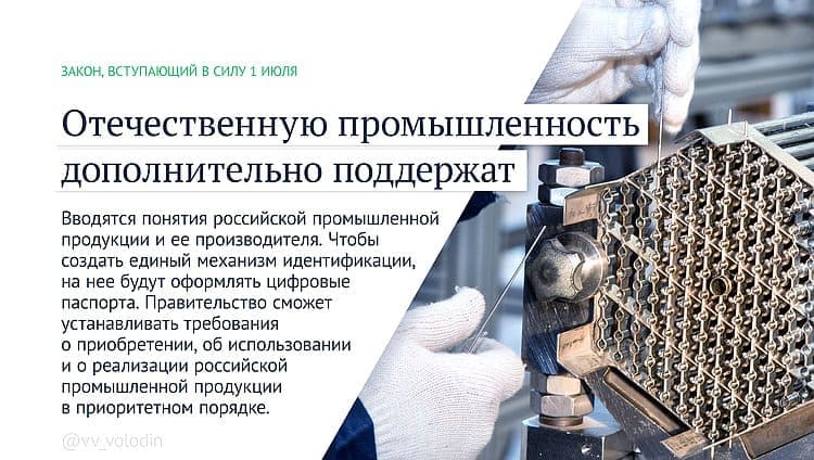 Вводятся понятия российской промышленной продукции и ее производителя. Чтобы создать единый механизм идентификации, на нее будут оформлять цифровые паспорта. Правительство сможет устанавливать требования о приобретении, об использовании и о реализации российской промышленной продукции в приоритетном порядке.