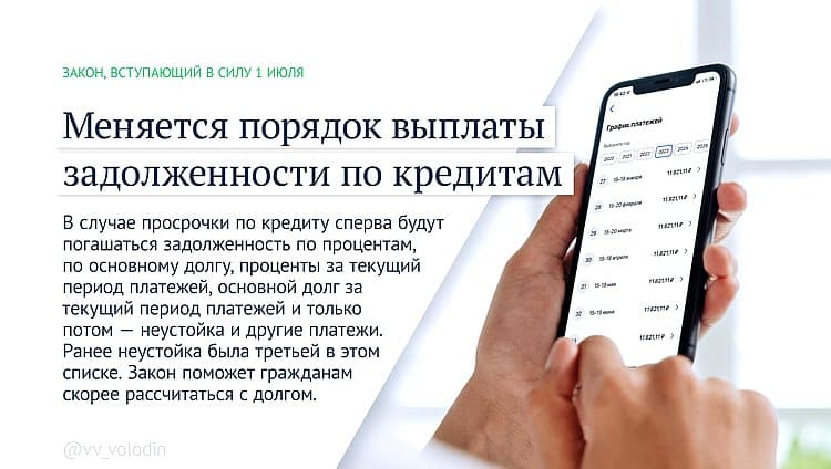 В случае просрочки по кредиту сперва будут погашаться задолженность по процентам, по основному долгу, проценты за текущий период платежей, основной долг за этот период и только потом — неустойка и другие платежи. Ранее неустойка была третьей в этом списке. Закон поможет гражданам скорее рассчитаться с долгом.