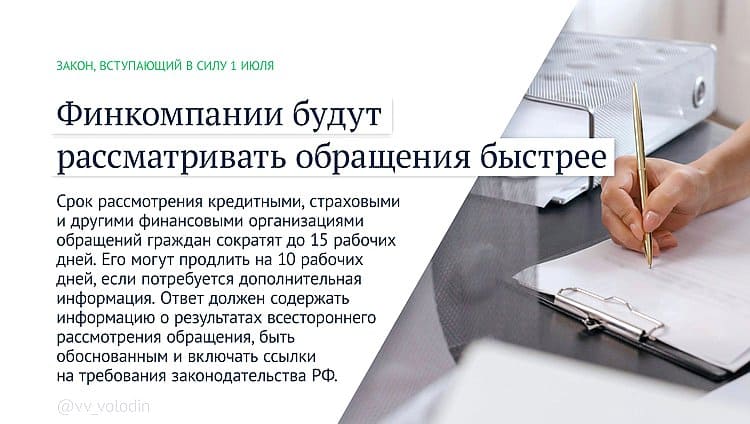 Срок рассмотрения кредитными, страховыми и другими финансовыми организациями обращений граждан сократят до 15 рабочих дней. Его могут продлить на 10 рабочих дней, если потребуется дополнительная информация. Ответ должен содержать информацию о результатах всестороннего рассмотрения обращения, быть обоснованным и включать ссылки на требования законодательства РФ.