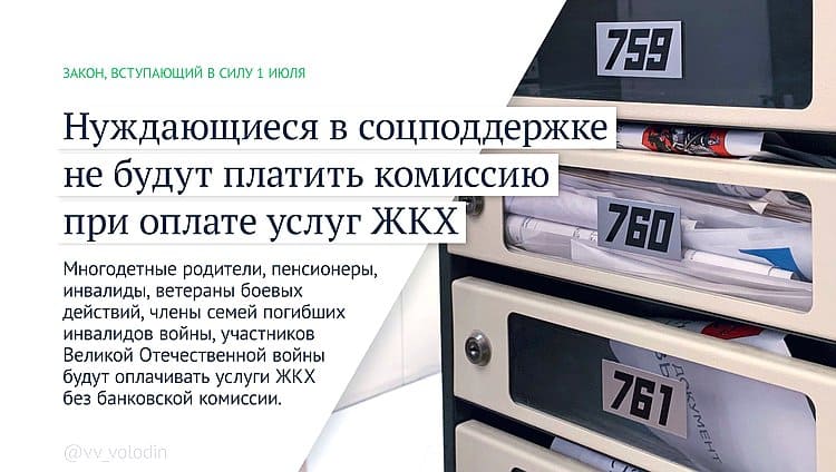 «Норма принятого закона будет носить адресный характер. Она коснется тех, кто нуждается в социальной поддержке», — сказал Вячеслав Володин. — Коммунальные платежи — обязательная ежемесячная часть расходов, для многих комиссия ощутима. Принятый закон снизит финансовую нагрузку и обеспечит социальную защиту людей».
