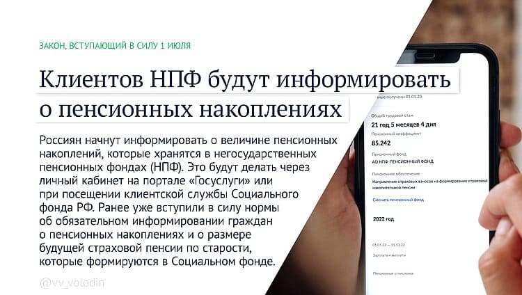 Россиян начнут информировать о величине пенсионных накоплений, которые хранятся в негосударственных пенсионных фондах (НПФ). Это будут делать через личный кабинет на портале «Госуслуги» или при посещении клиентской службы Социального фонда РФ. Ранее уже вступили в силу нормы об обязательном информировании граждан о пенсионных накоплениях и о размере будущей страховой пенсии по старости, которые формируются в Социальном фонде.