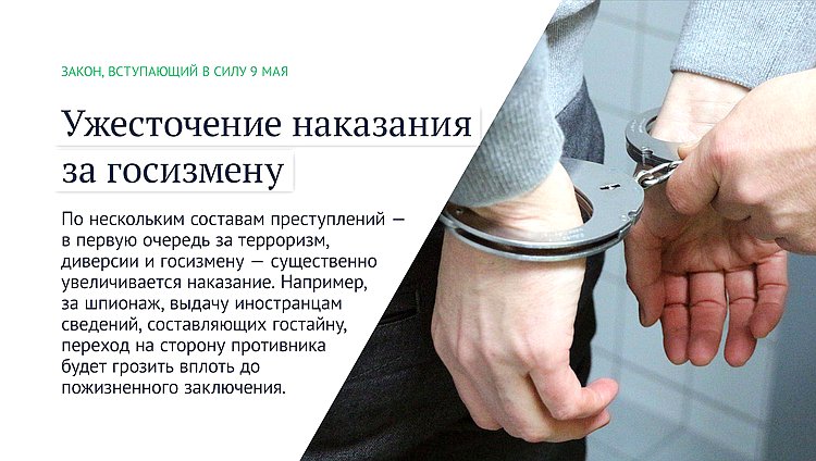 По нескольким составам преступлений — в первую очередь за терроризм, диверсии и госизмену — существенно увеличивается наказание. Например, за шпионаж, выдачу иностранцам сведений, составляющих гостайну, переход на сторону противника будет грозить вплоть до пожизненного заключения.