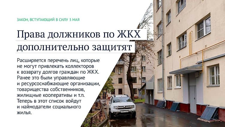 Расширяется перечень лиц, которые не могут привлекать коллекторов к возврату долгов граждан по ЖКХ. Ранее это были управляющие и ресурсоснабжающие организации, товарищества собственников, жилищные кооперативы и т. п. Теперь в этот список войдут и наймодатели социального жилья.