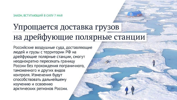 Российские воздушные суда, доставляющие людей и грузы с территории РФ на дрейфующие полярные станции, смогут неоднократно пересекать границу России без прохождения пограничного, таможенного и других видов контроля. Изменения будут способствовать дальнейшему изучению и освоению арктических регионов России.