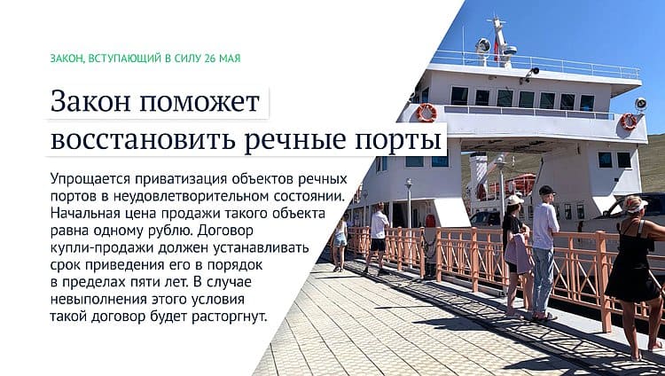 Упрощается приватизация объектов речных портов в неудовлетворительном состоянии. Начальная цена продажи такого объекта равна одному рублю. Договор купли-продажи должен устанавливать срок приведения его в порядок в пределах пяти лет. В случае невыполнения этого условия такой договор будет расторгнут.