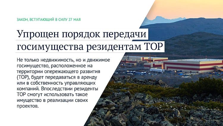 Не только недвижимость, но и движимое госимущество, расположенное на территории опережающего развития (ТОР), будет передаваться в аренду или в собственность управляющих компаний. Впоследствии резиденты ТОР смогут использовать такое имущество в реализации своих проектов.