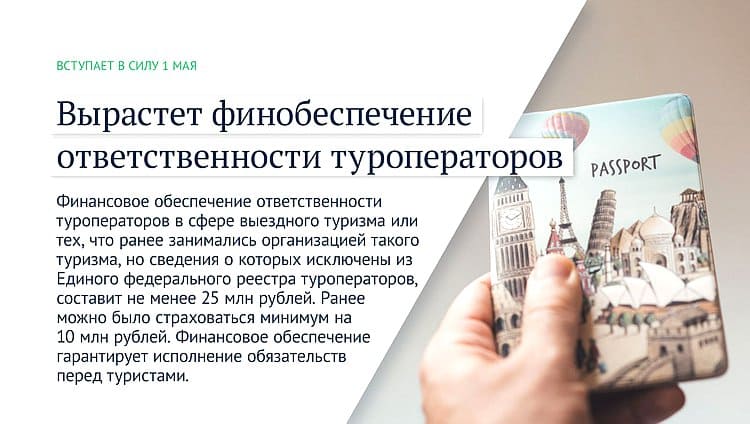 Финансовое обеспечение ответственности туроператоров в сфере выездного туризма или тех, что ранее занимались организацией такого туризма, но сведения о которых исключены из Единого федерального реестра туроператоров, составит не менее 25 млн рублей. Ранее можно было страховаться минимум на 10 млн рублей. Финансовое обеспечение гарантирует исполнение обязательств перед туристами.