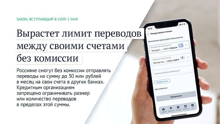 С мая вырастет лимит переводов между своими счетами без комиссии, изменится механизм целевого обучения, а также заработает еще одна мера по защите прав должников.