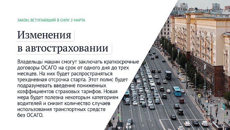 Владельцы машин смогут заключать краткосрочные договоры ОСАГО на срок от одного дня до трех месяцев. На них будет распространяться трехдневная отсрочка старта. Этот полис будет подразумевать введение пониженных коэффициентов страховых тарифов. Новая мера будет полезна некоторым категориям водителей и снизит количество случаев использования транспортных средств без ОСАГО.