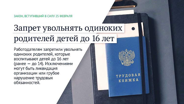 Работодателям запретили увольнять одиноких родителей, которые воспитывают детей до 16 лет (ранее — до 14). Исключениями могут быть ликвидация организации или грубое нарушение трудовых обязанностей.