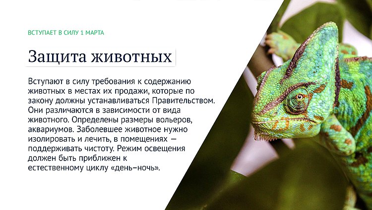 Вступают в силу требования к содержанию животных в местах их продажи, которые по закону должны устанавливаться Правительством. Они различаются в зависимости от вида животного. Определены размеры вольеров, аквариумов. Заболевшее животное нужно изолировать и лечить, в помещениях — поддерживать чистоту. Режим освещения должен быть приближен к естественному циклу «день–ночь».