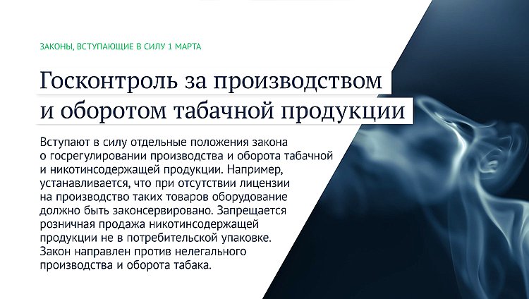 Вступают в силу отдельные положения закона о госрегулировании производства и оборота табачной и никотинсодержащей продукции. Например, устанавливается, что при отсутствии лицензии на производство таких товаров оборудование должно быть законсервировано. Запрещается розничная продажа никотинсодержащей продукции не в потребительской упаковке. Закон направлен против нелегального производства и оборота табака.