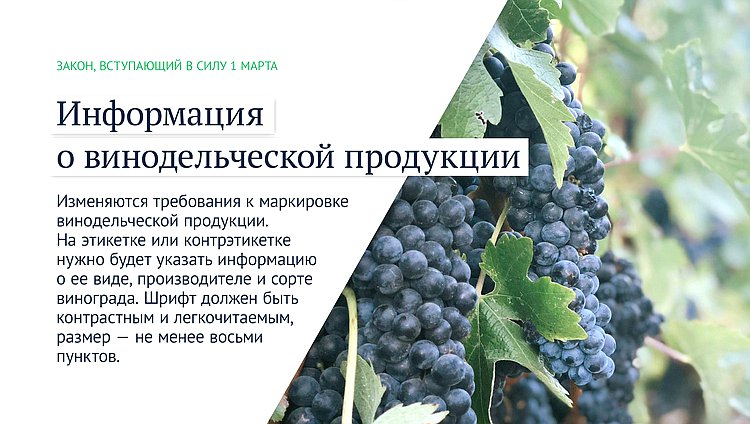 Изменяются требования к маркировке винодельческой продукции. На этикетке или контрэтикетке нужно будет указать информацию о ее виде, производителе и сорте винограда. Шрифт должен быть контрастным и легкочитаемым, размер — не менее восьми пунктов.