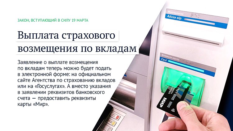 Заявление о выплате возмещения по вкладам теперь можно будет подать в электронной форме: на официальном сайте Агентства по страхованию вкладов или на «Госуслугах». А вместо указания в заявлении реквизитов банковского счета — предоставить реквизиты карты «Мир».